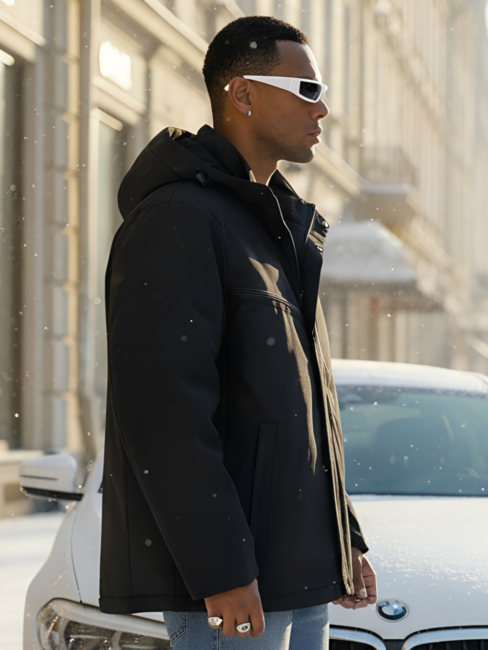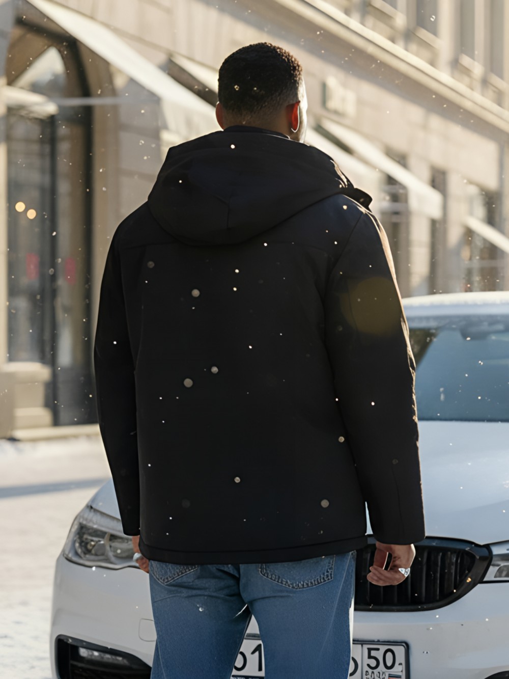 Капюшон надежно защищает от различных внешних факторов, таких как ветер.