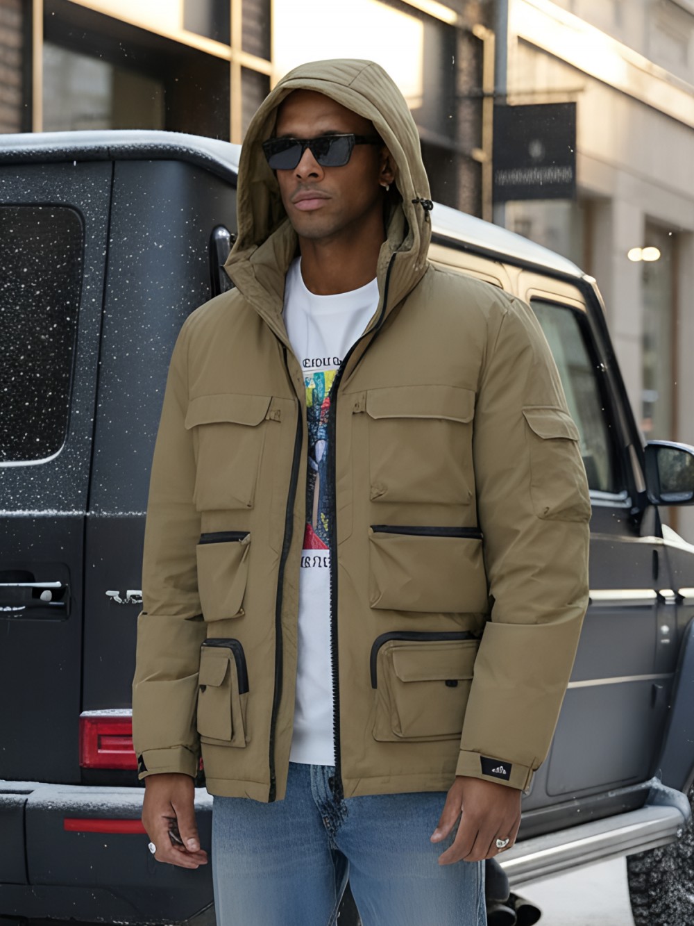 Капюшон надежно защищает от различных внешних факторов, таких как ветер.